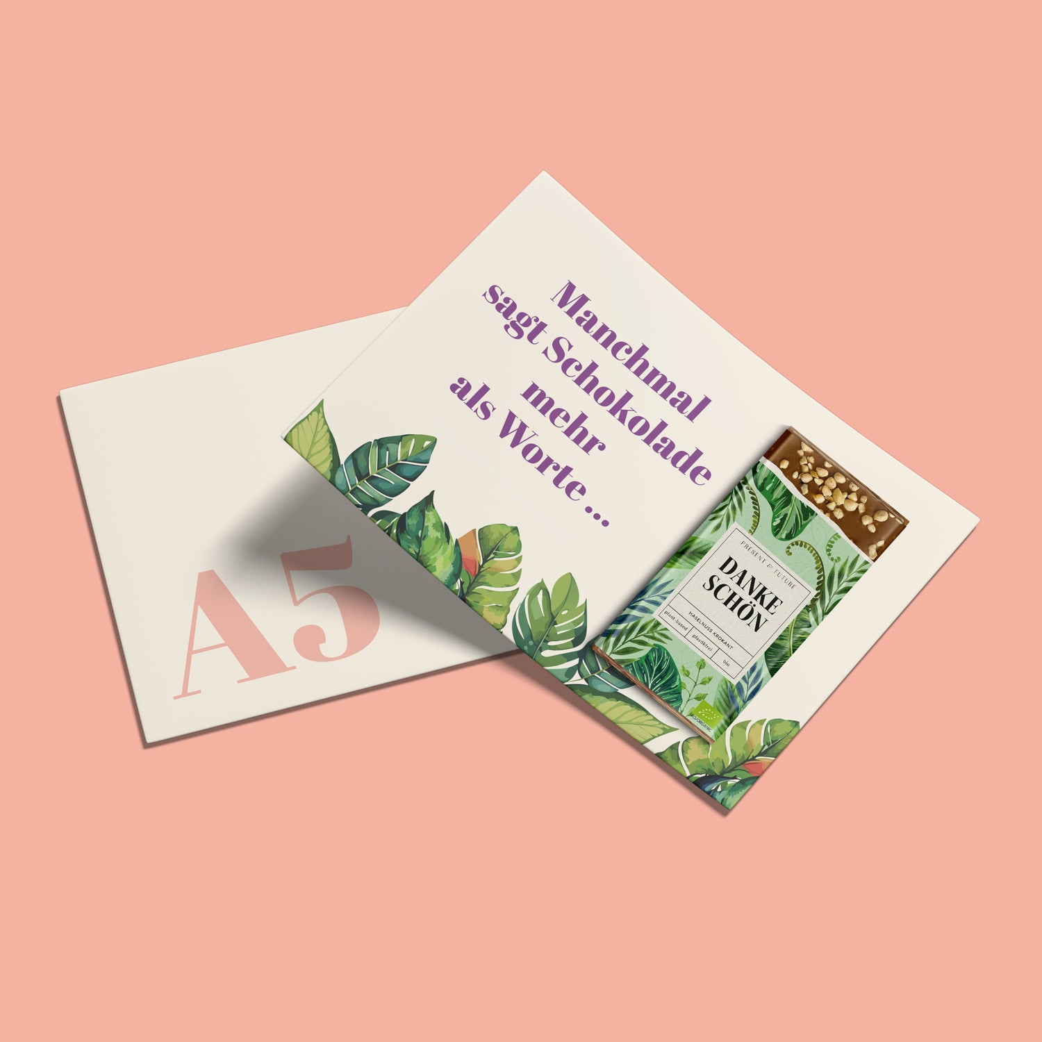 Kreative und persönliche Gesten machen den Unterschied: Die individuell gestaltbare Postkarte kombiniert eine Botschaft mit einer Bio-Schokoladentafel als süßes Extra.